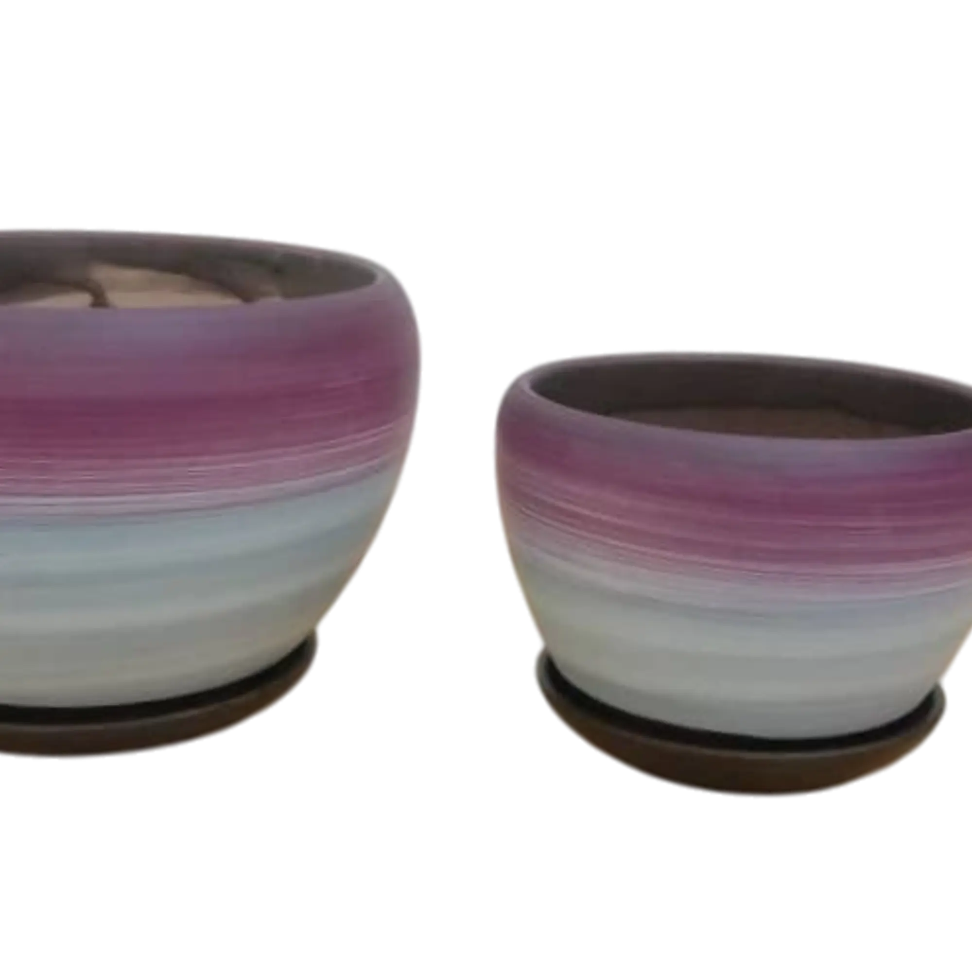 Color: Dark purple at the top, fading into a light blue or off-white color at the bottom. They rest on dark brown saucers.