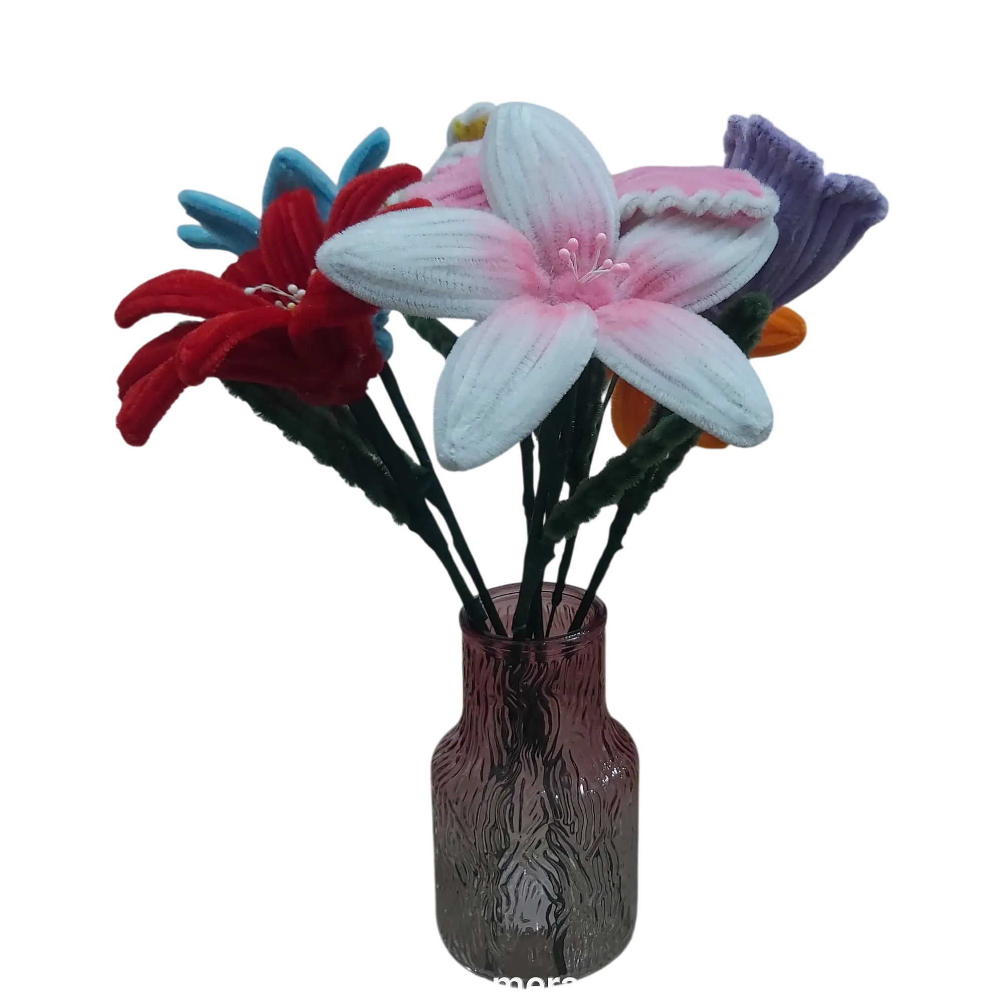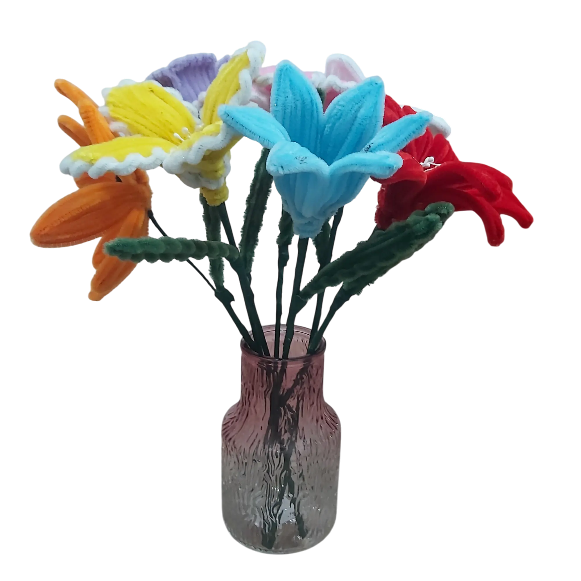 Handcrafted flower bouquet with vase. It contains seven different flowers in single vase. Best for gifting and decoration.