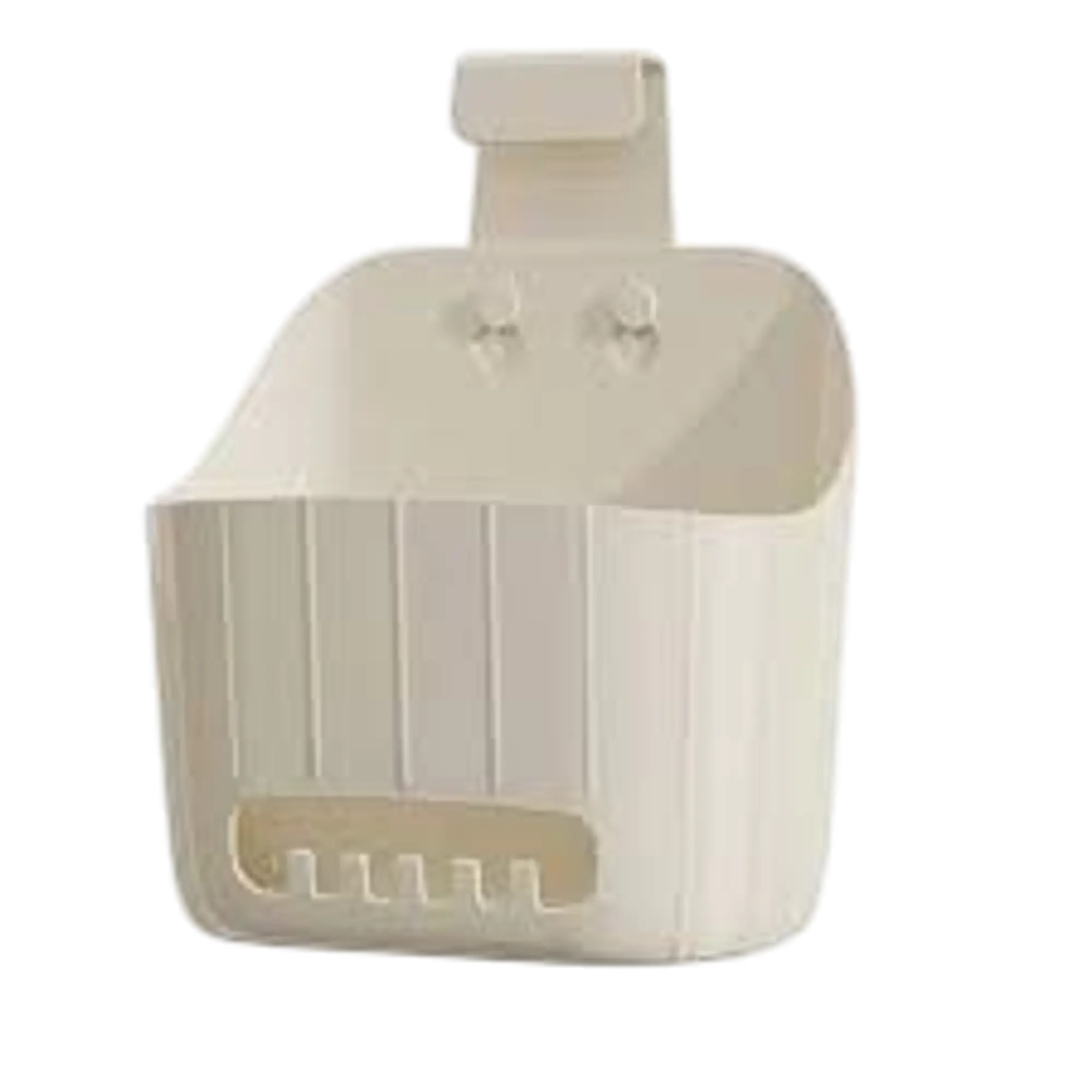 A versatile organization caddy designed for use in bathrooms, kitchens, and dorm rooms. It features a large main compartment for items like shampoo or sponges, integrated front hooks for hanging accessories, and a curved top hook for easy mounting on rods or cabinet doors.